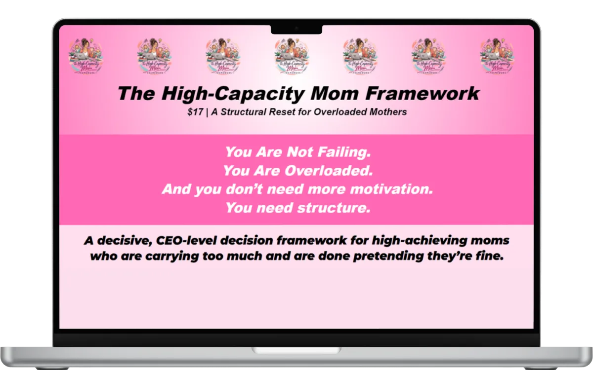 The High-Capacity Mom Framework is a decisive, CEO-level decision framework for high-achieving moms who are carrying too much and are done pretending they’re fine. Designed for capable women managing homes, careers, and invisible labor, it helps you reduce overwhelm, eliminate unnecessary tasks, reset draining standards, and rebuild your week with clarity and control.